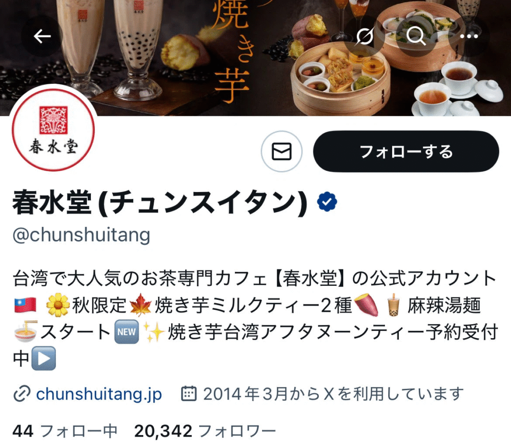 春水堂(チュンスイタン)は、Xを通してお客様と密にコミュニケーションを取る企業の一つです。フォロワー数は約2万人。毎日のようにタイムラインには「おいしい」「○○が好き」といった利用者の投稿が並び、公式アカウントはそれらをリポストして積極的に反応しています。