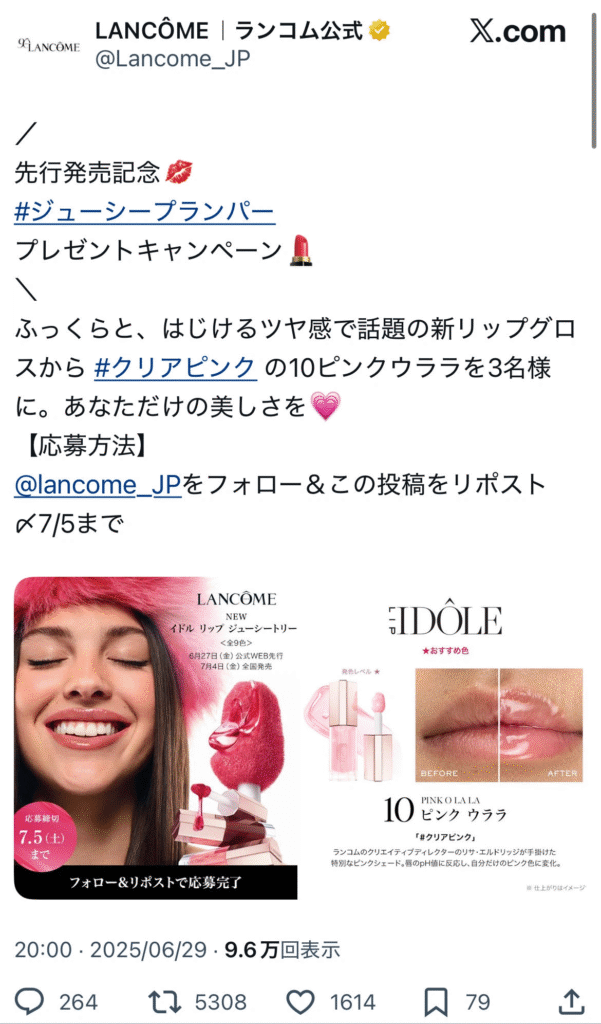 実際に当選・購入したユーザーが「このリップすごく良かった」「色がかわいくて好き」などとX上で自然に投稿することで、リアルな口コミが連鎖的に広がっていくのです。